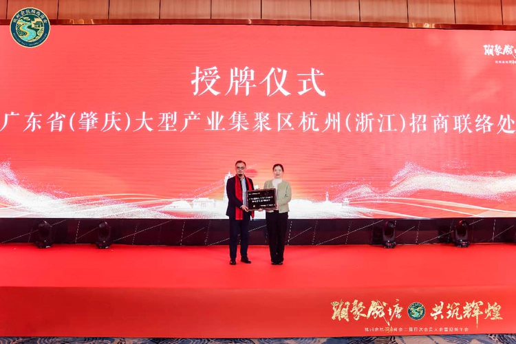 粤桂合作特别试验区(肇庆)管委会副主任范碧,向会长彭中云授予广东省(肇庆)大型产业集聚区杭州(浙江)招商联络处牌匾