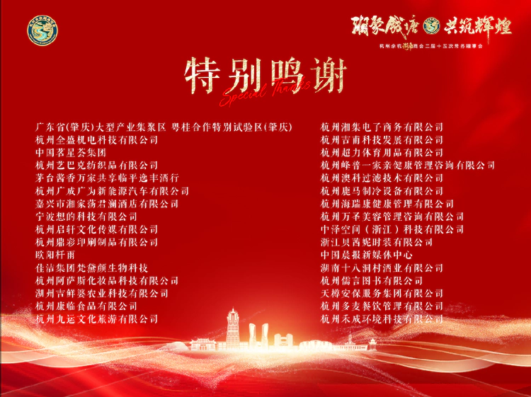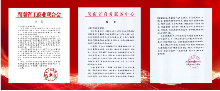 湖南省工商业联合会;湖南省商务服务中心;杭州市常德商会;杭州市怀化商会;杭州市盐城商会;杭州市株洲商会;浙江省新疆商会;金华市湖南商会;金华市永州商会;绍兴市柯桥区中国轻纺城湖南商会;浙江省酒店用品协会;浙江省供应链与仓储行业协会;杭州市咸宁商会;衢州市湖南商会;浙江省青年创业协会;桐乡市湖南商会;杭州市益阳商会;澳大利亚南澳湖南商会等纷纷发来贺信,字里行间饱含着对我会发展的殷切期许,也为湘商在杭州的深耕聚力注入了温暖力量。