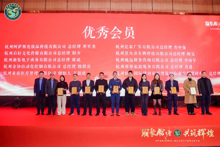 杭州市委社会工作部处长姜剑涛,拱墅区人大副主任周钢,余杭工商联会员部部长张国忠给优秀会员颁奖